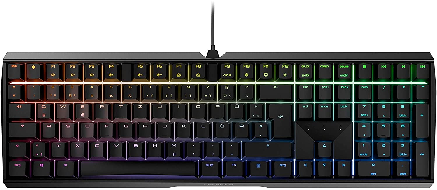 ? CHERRY MX Technologie – Gold-Crosspoint-Präzisionsschalter für alle Tasten »Made in Germany« ? Variantenabhängige Beleuchtungsmöglichkeiten reichen von unbeleuchtet, monochrom bis hin zu RGB mit Farbspielen in über 16 Millionen Farben