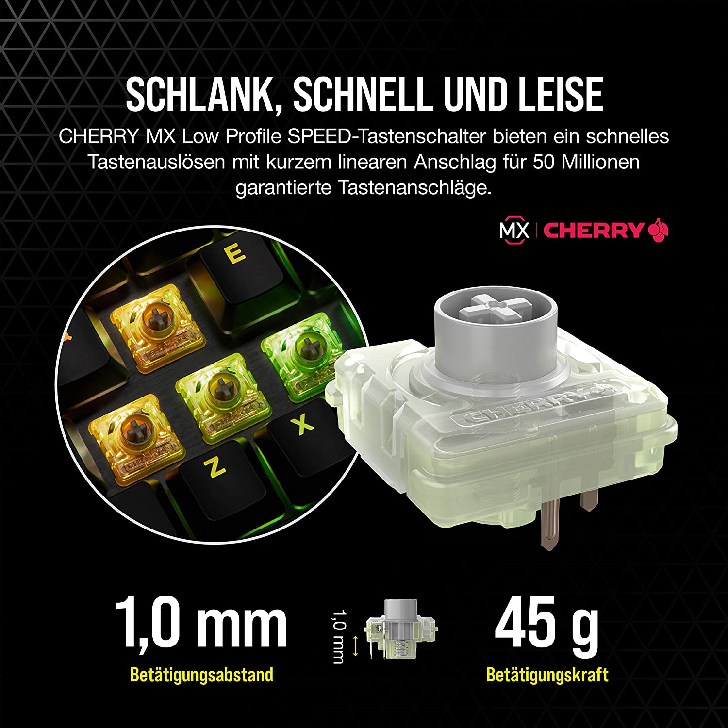 - Die 100 % mechanischen CHERRY MX Low Profile RGB SPEED-Tastenschalter verfügen über einen unglaublich geringen Betätigungsabstand von nur 1,0 mm und erlauben so unvergleichlich schnelles Gameplay bei weicherem Tastendruckton und garantierten 50 Mio. Tastenanschlägen.