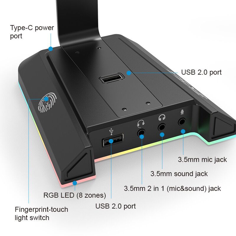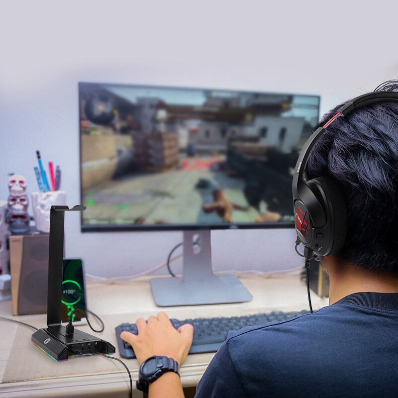 RGB-Kopfhörerständer: Mit diesem Headset-Ständer können Sie Ihren Platz auf dem Schreibtisch organisieren, Ihre Kopfhörer (einen oder zwei) bequem aufbewahren und sicherstellen, dass sie immer griffbereit sind.