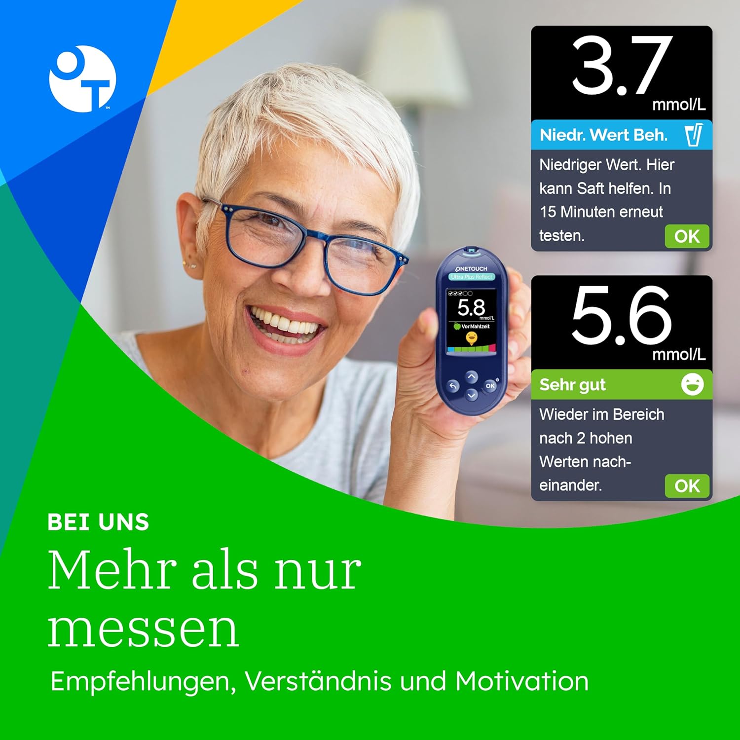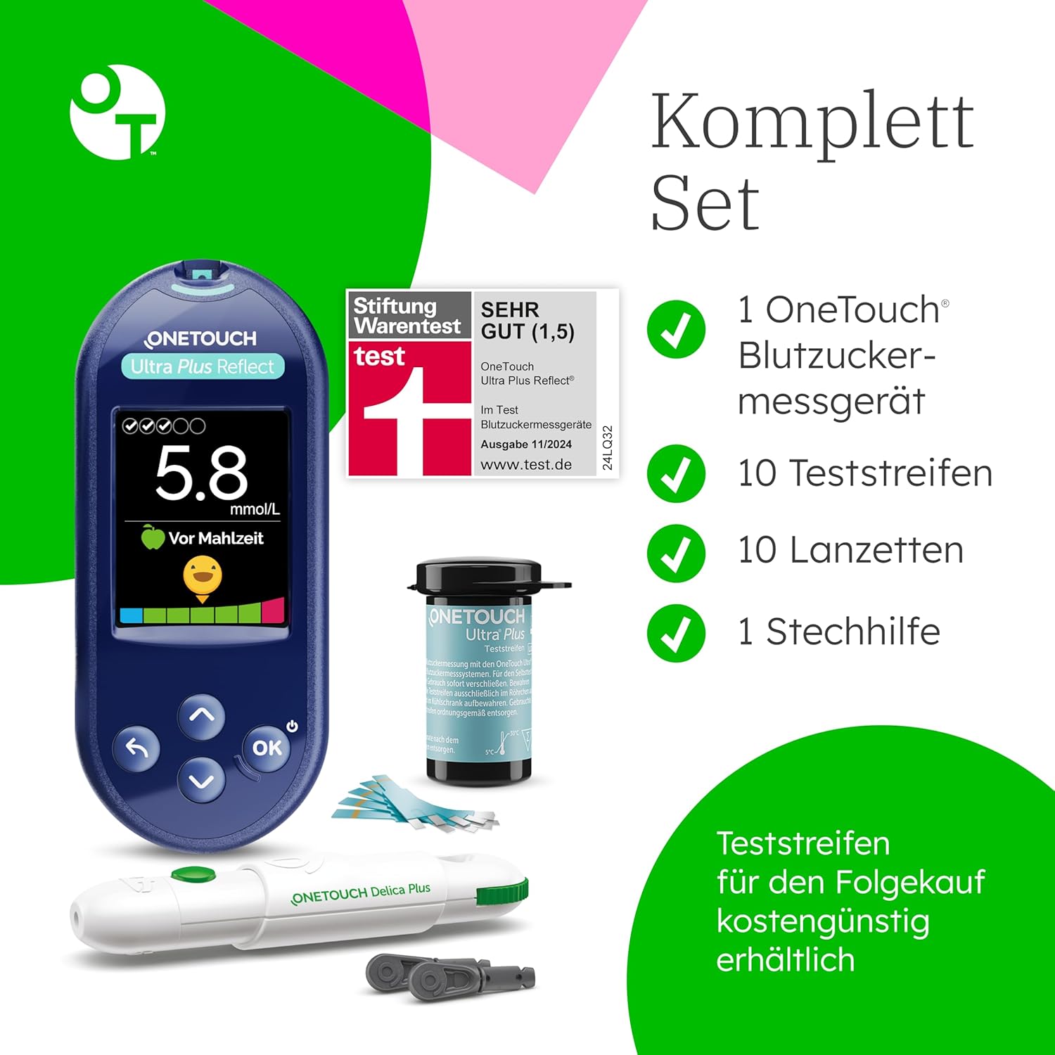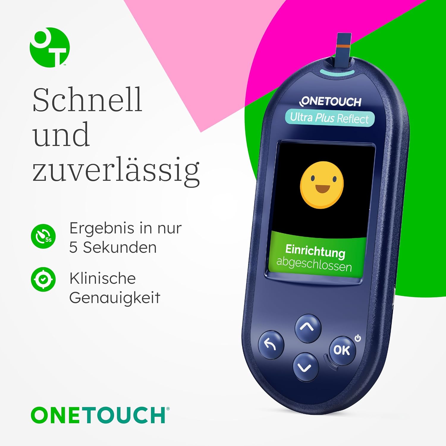 DAS MESSGERÄT, DAS IHRE SPRACHE SPRICHT: Sie können aus 20 Sprachen wählen, wie die Meldungen auf dem Gerät angezeigt werden sollen. SCHNELLE and GENAUE ERGEBNISSE: Erhalten Sie zuverlässige Blutzucker-Testergebnisse in nur 5 Sekunden und kontrollieren Sie hohe oder niedrige Blutzuckerwerte unterwegs oder zu Hause. OneTouch Ultra Plus Teststreifen für Diabetes benötigen nur eine winzige Menge Blut seitlich des Blutzucker-Teststreifens für genaue Ergebnisse. FARBIGE ERGEBNISSE: Die ColorSure Bereichsanzeige des Messgerätes benachrichtigt Sie, wenn sich Ihre Blutzuckermesswerte Ihrem oberen oder unteren Grenzwert nähern. EINFACH ZU BENUTZEN: Legen Sie einfach einen neuen Teststreifen ein, tragen Sie einen kleinen Tropfen Blut auf und lesen Sie Ihr Glukose-Ergebnis ab – nach nur 5 Sekunden. TRAGBARES BLUTZUCKER-TESTKIT: Das Messgerät enthält alle Komponenten, die Sie zur Durchführung eines Blutzuckertests benötigen – unterwegs oder zu Hause. KOMPLETTES DIABETES-TESTSET: Enthält 1 OneTouch Ultra Plus Reflect Blutzuckermessgerät, 10 OneTouch Ultra Plus Teststreifen, 10 OneTouch Delica Plus Lanzetten, 1 OneTouch Delica Plus Stechhilfe und 1 Stoffbeutel – alles, was Sie für die Blutzuckerkontrolle brauchen.