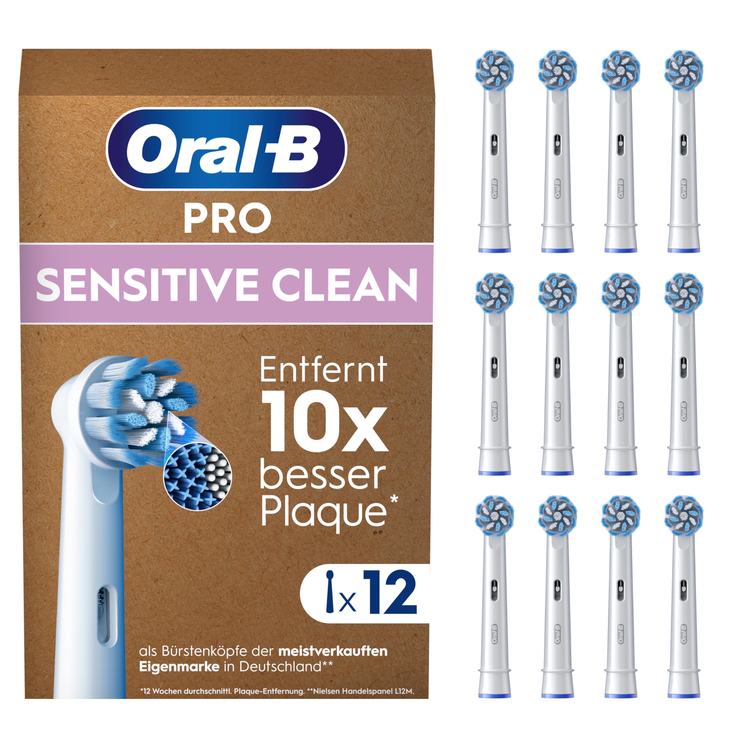 Oral-B ist die von Zahnärzten weltweit AM HÄUFIGSTEN VERWENDETE MARKE mit klinisch nachgewiesenen Ergebnissen. Zahnärzte empfehlen: Die Aufsteckbürste ALLE 3 MONATE WECHSELN für 100 Prozent Putzkraft. DESIGNED & MADE IN GERMANY – rte Passform mit allen wiederaufladbaren elektrischen Zahnbürsten von Oral-B, außer Pulsonic & iO. Entfernt bis zu 100 Prozent mehr bakterielle Plaque als eine Handzahnbürste – für SAUBERERE ZÄHNE UND GESÜNDERES ZAHNFLEISCH. Oral-B Pro Sensitive Clean bietet eine hohe Dichte an EXTRA-WEICHEN BORSTEN für eine besonders SANFTE ZAHNREINIGUNG. ORIGINAL BÜRSTENKÖPFE von Oral-B mit innovativen X-förmigen Borsten: Reinigen die Stellen, die normale Borsten nicht erreichen können – für eine OPTIMALE REINIGUNGSLEISTUNG. Klinisch bestätigt: ENTFERNT 10X BESSER PLAQUE als Bürstenköpfe der MEISTVERKAUFTEN EIGENMARKE in Deutschland (12 Wochen durchschnittl. Plaqueentfernung, Nielsen Handelspanel L12M). EINFACHE LIEFERUNG: 12 Oral-B Pro Sensitive Clean Aufsteckbürsten in unbedruckter KARTONVERPACKUNG FÜR DEN BRIEFKASTEN (aus hygienischen Gründen einzeln verpackt).