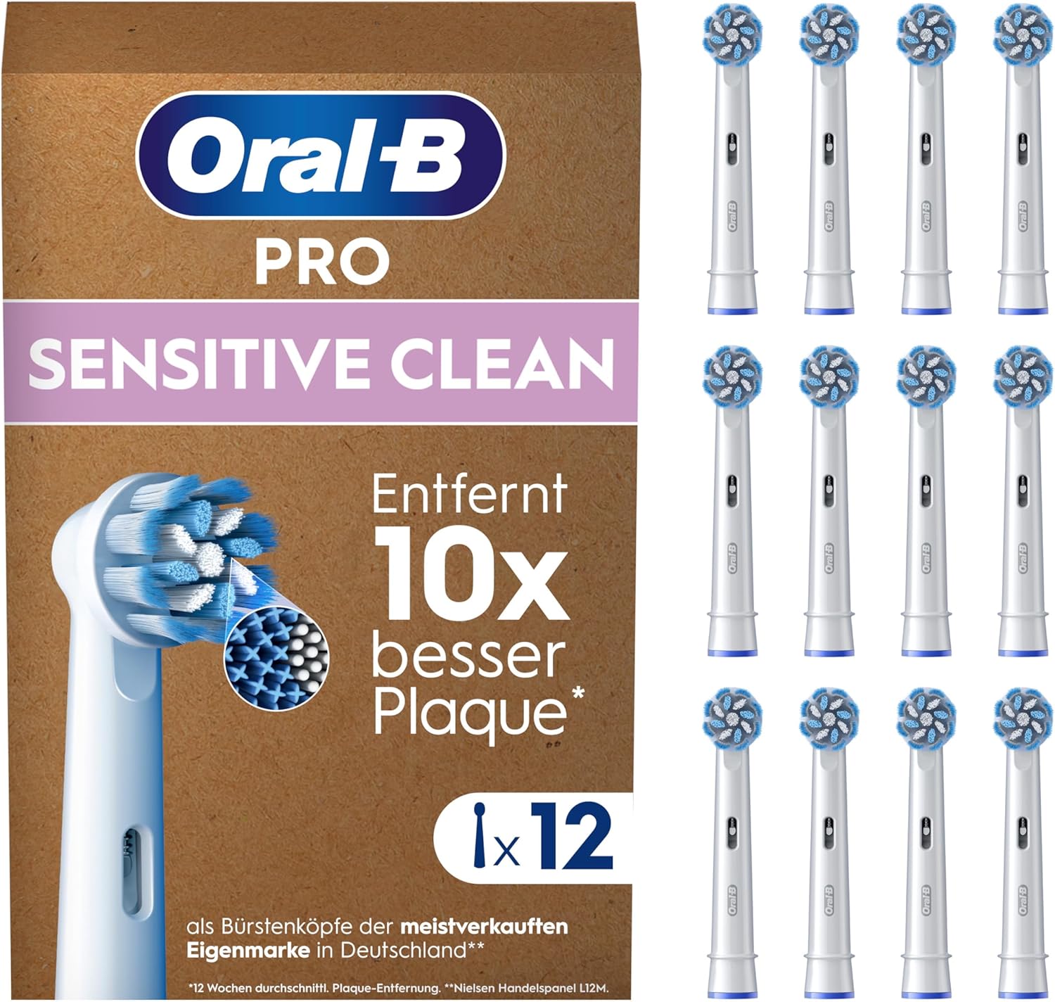 Oral-B ist die von Zahnärzten weltweit AM HÄUFIGSTEN VERWENDETE MARKE mit klinisch nachgewiesenen Ergebnissen. Zahnärzte empfehlen: Die Aufsteckbürste ALLE 3 MONATE WECHSELN für 100 Prozent Putzkraft. DESIGNED & MADE IN GERMANY – rte Passform mit allen wiederaufladbaren elektrischen Zahnbürsten von Oral-B, außer Pulsonic & iO. Entfernt bis zu 100 Prozent mehr bakterielle Plaque als eine Handzahnbürste – für SAUBERERE ZÄHNE UND GESÜNDERES ZAHNFLEISCH. Oral-B Pro Sensitive Clean bietet eine hohe Dichte an EXTRA-WEICHEN BORSTEN für eine besonders SANFTE ZAHNREINIGUNG. ORIGINAL BÜRSTENKÖPFE von Oral-B mit innovativen X-förmigen Borsten: Reinigen die Stellen, die normale Borsten nicht erreichen können – für eine OPTIMALE REINIGUNGSLEISTUNG. Klinisch bestätigt: ENTFERNT 10X BESSER PLAQUE als Bürstenköpfe der MEISTVERKAUFTEN EIGENMARKE in Deutschland (12 Wochen durchschnittl. Plaqueentfernung, Nielsen Handelspanel L12M). EINFACHE LIEFERUNG: 12 Oral-B Pro Sensitive Clean Aufsteckbürsten in unbedruckter KARTONVERPACKUNG FÜR DEN BRIEFKASTEN (aus hygienischen Gründen einzeln verpackt).