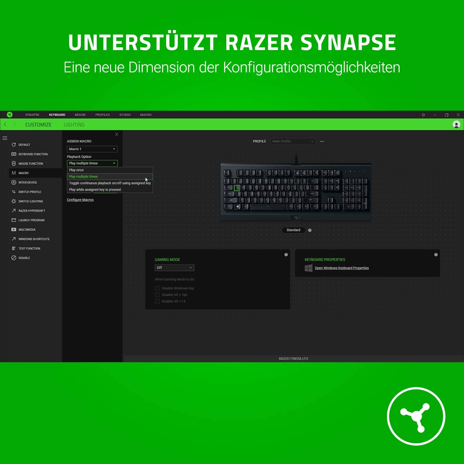- Unterstützt Razer Synapse: Endlich eine Tastatur, wie sie sonst niemand hat. Mit Razer Synapse lassen sich Tasten neu belegen, Makros zuweisen, die Beleuchtung persönlich anpassen und das Gameplay vollkommen individuell gestalten. Mit diesem vereinheitlichten Tool zur Hardware-Konfiguration sind bei der persönlichen Gestaltung absolut keine Grenzen gesetzt