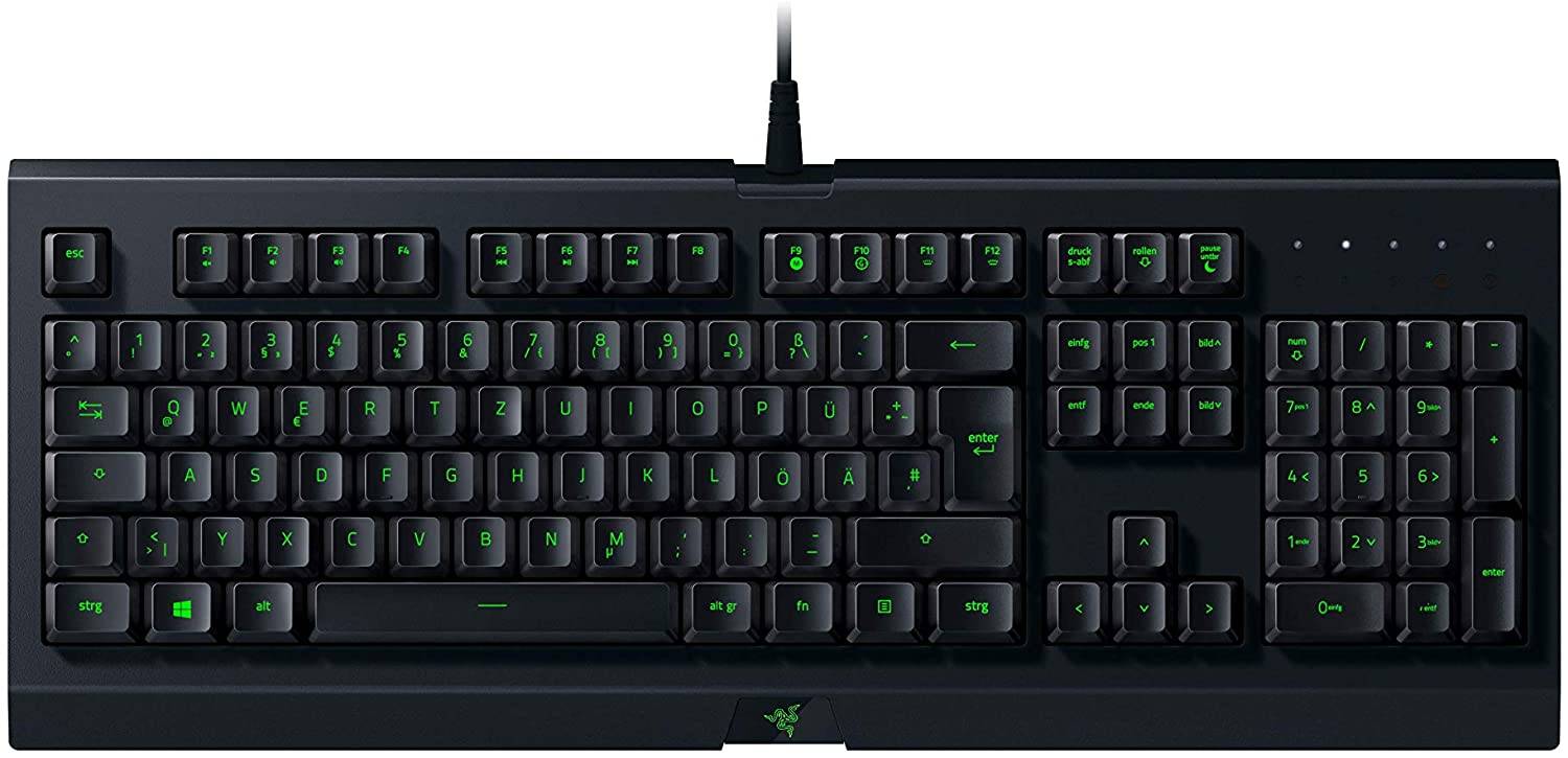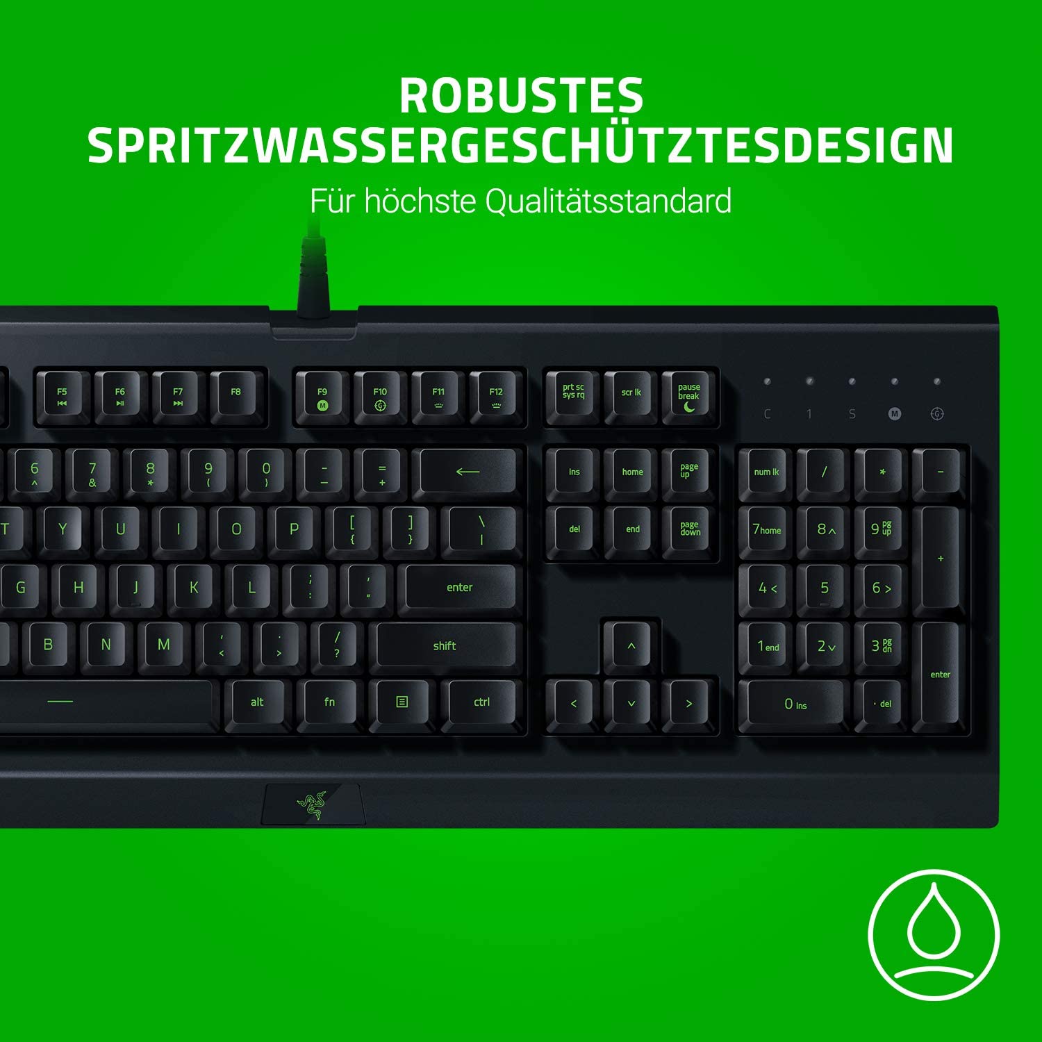 - Robustes spritzwassergeschütztes Design: Keine Sorge, falls bei einem intensiven Match die Reaktion mal etwas zu heftig ausfallen sollte. Dank des spritzwassergeschützten Gehäuses machen der Razer Cynosa Lite versehentlich verschüttete Flüssigkeiten keine Probleme, wodurch sich die ohnehin schon lange Lebensdauer der Tastatur noch weiter verlängert