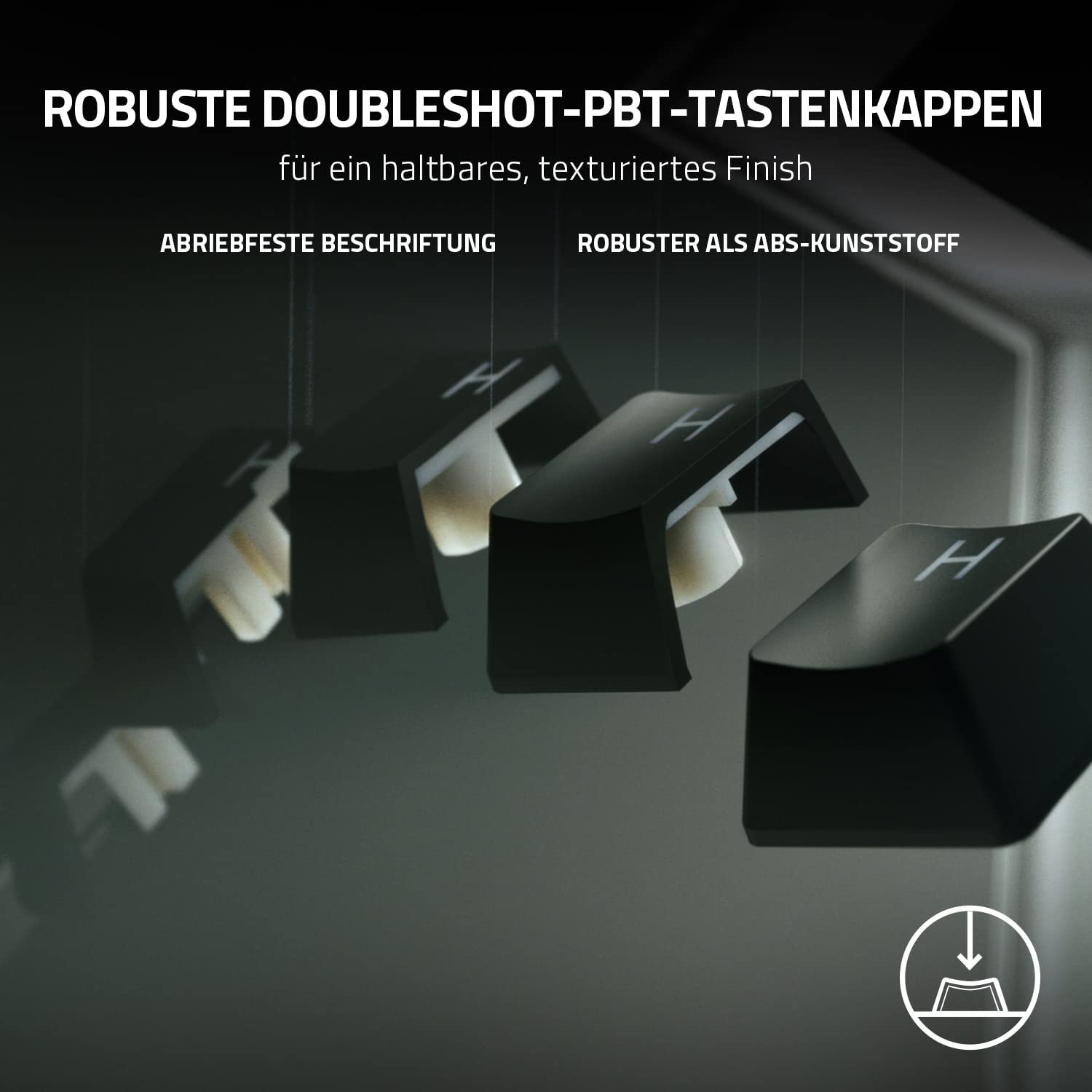 - Doubleshot PBT-Tastenkappen Für ein robustes, texturiertes Finish: Diese Tastenkappen sind härter und robuster als ABS-Kunststoff. Dank der Herstellung per Doubleshot-Gussverfahren werden sie mit der Zeit auch nicht blank und die Beschriftung wird niemals verblassen oder sich abnutzen.
