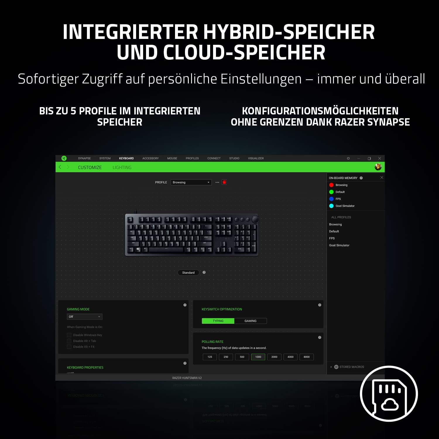 - Schalldämmender Schaumstoff Für einen noch besseren Sound beim Tippen: Für einen noch besseren Sound beim Tippen hat die Razer Huntsman V2 in ihrem Gehäuse eine Schicht Spezialschaumstoff, der alle metallischen Geräusche absorbiert, die beim Drücken der Tasten auftreten können.