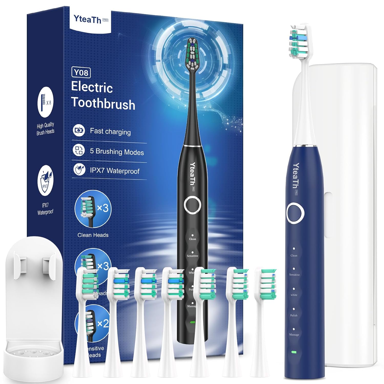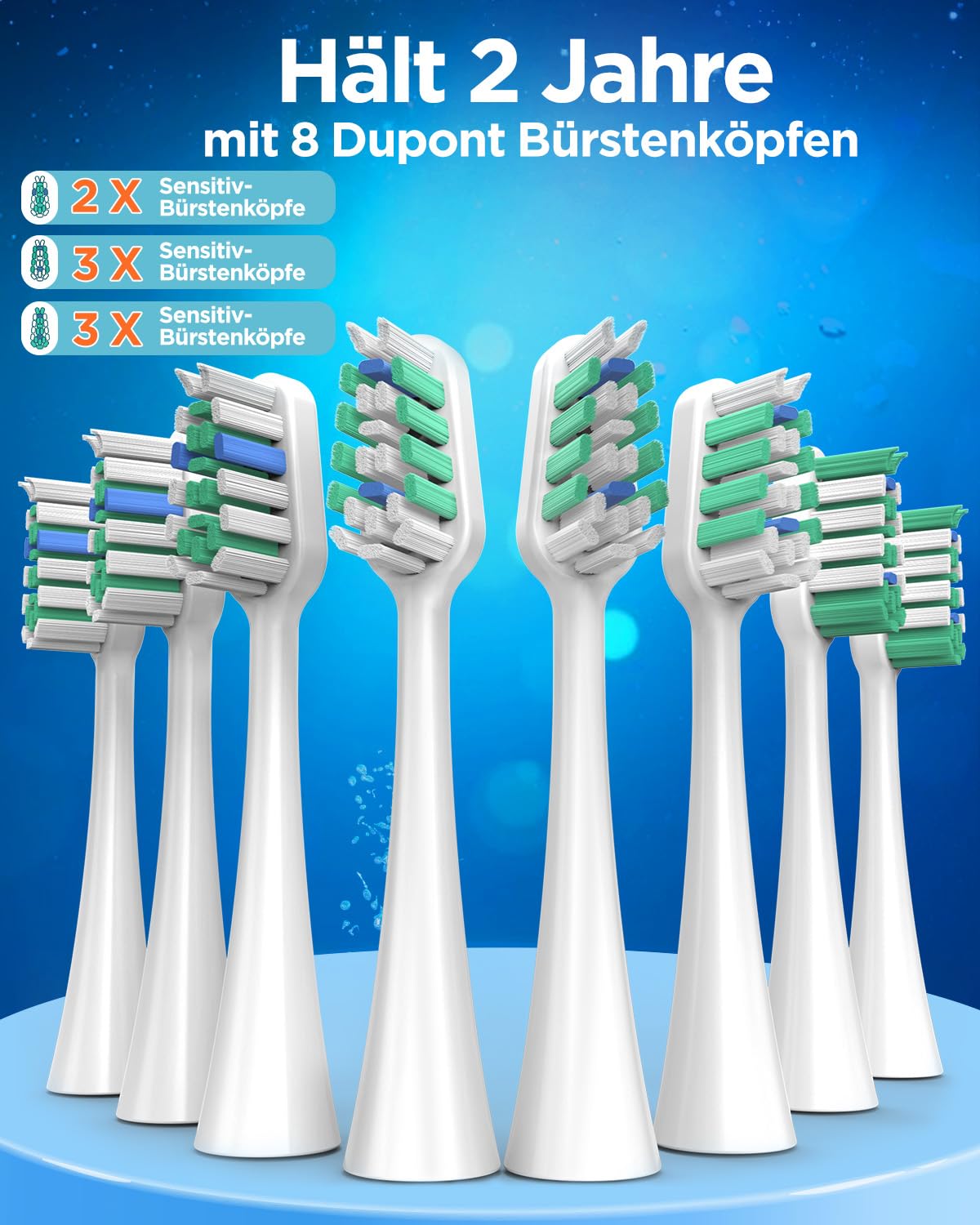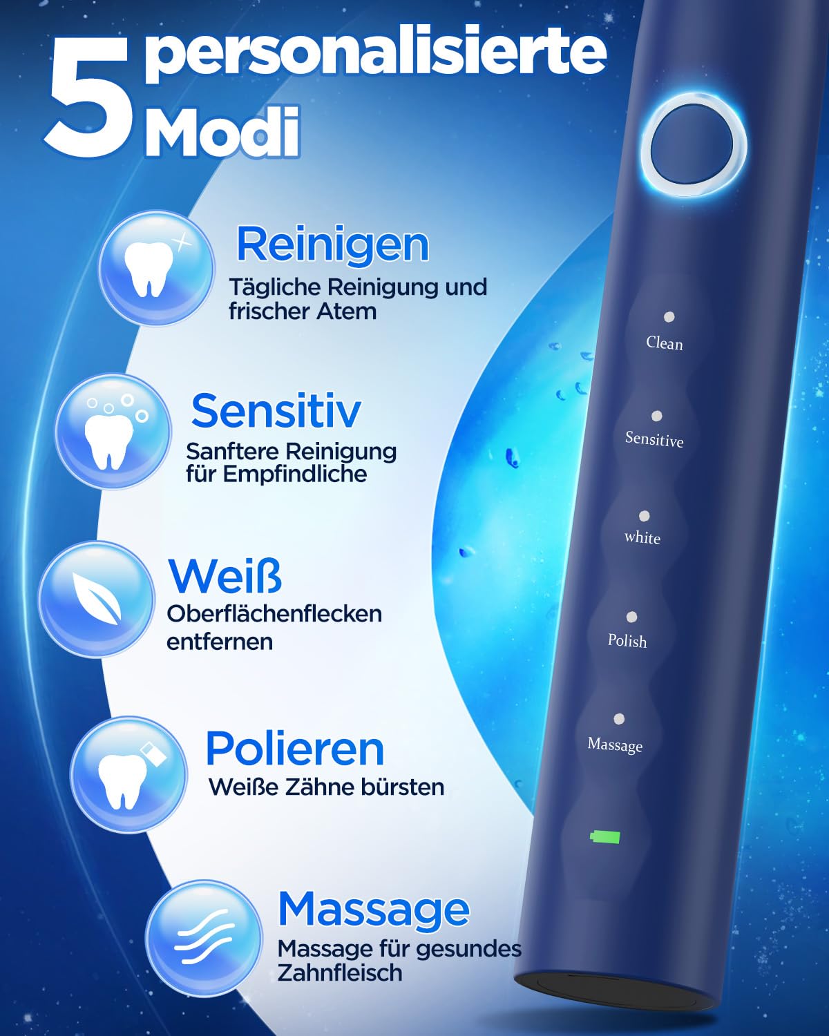 Pflegt unterschiedliche Zahnbedürfnisse: – Die wiederaufladbare ultraschall elektrische Zahnbürste für Erwachsene bietet 5 effektive Putzmodi, um Ihre unterschiedlichen Mundpflegebedürfnisse zu erfüllen. Zu Beginn verwenden Sie den Sensitivmodus (für Anfänger oder empfindliche Zähne) und wechseln dann zu Reinigen (für die tägliche Reinigung), Weiß (zur Entfernung hartnäckiger Verfärbungen), Polieren (für hellere Zähne) und Massage (zur Verbesserung der Gesundheit des Zahnfleisches und der Durchblutung). Zum Ausschalten 2 Sekunden lang gedrückt halten. Starten Sie neu, um den letzten Putzmodus wiederherzustellen. Im Lieferumfang enthalten – Reiseetui und Wandhalterung: Das Reiseetui ermöglicht es Ihnen, Ihre elektrische Zahnbürste hygienisch aufzubewahren und einfach auf Reisen mitzunehmen, was ideal für die Erhaltung der Mundgesundheit unterwegs ist. Die wandmontierte Zahnbürstenhalterung hält die Schallzahnbürste trocken, reduziert Kalkablagerungen und spart Platz auf der Arbeitsfläche. Wissenschaftliches und effektives Zähneputzen: Unsere Schallzahnbürste verfügt über eine Intervallpause alle 30 Sekunden, um Sie daran zu erinnern, einen anderen Bereich Ihres Mundes zu reinigen. Zudem wird signalisiert, wenn die 2-minütige Putzzeit abgelaufen ist. Dies hilft sicherzustellen, dass Sie die wissenschaftlich empfohlene Putzdauer einhalten und eine gründliche Reinigung erreichen. Geeignet für Erwachsene und Kinder. 8 Bürstenköpfe für 24 Monate: Die elektrische Zahnbürste wird mit 8 Bürstenköpfen geliefert, die Borsten in drei verschiedenen Farben haben, um eine einfache Unterscheidung der Köpfe bei der Nutzung durch verschiedene Familienmitglieder zu ermöglichen. Es wird empfohlen, den Bürstenkopf alle 3 Monate zu wechseln, was Ihnen eine Gesamtgebrauchszeit von 24 Monaten mit den mitgelieferten Bürstenköpfen ermöglicht. Dies eliminiert die Notwendigkeit, häufig neue Bürstenköpfe zu kaufen. 120 Tage Akkulaufzeit – Bis zu 120 Tagen bei zweimal täglichem Gebrauch für jeweils zwei Minuten. Eine vollständige Aufladung dauert nur 3,5 Stunden, sodass die Zahnbürste lediglich dreimal im Jahr aufgeladen werden muss. Einmal aufladen, und die Zahnbürste hält monatelang durch. Perfekt für Reisen oder einfach, um sich nicht ständig ums Aufladen kümmern zu müssen. Wenn die rote LED-Ladeanzeige leuchtet, ist es Zeit, die Zahnbürste elektrische mit dem mitgelieferten USB-C-Kabel aufzuladen. Einer gründlichen und effektiven Reinigung: Die elektrische Zahnbürste entfernt bis zu 10-mal mehr Plaque und verbessert die Mundgesundheit sowie die effektive Vorbeugung von Karies im Vergleich zu einer Handzahnbürste. Die elektrische Schallzahnbürste bietet eine außergewöhnliche Reinigung, mit kraftvollen Vibrationen von 50.000 Impulsen pro Minute erreicht sie auch schwer zugängliche Bereiche zwischen Zähnen und Zahnfleisch, wodurch eine gründliche und dennoch sanfte Reinigung gewährleistet wird.
